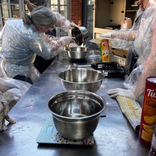 L'atelier dure un peu plus de 2 heures et chacun se fabrique 750 grammes de savon fait maison. Dans le commerce, le type de savons que nous vous apprenons à réaliser coûte environ 9 €/100g donc, faîtes des économies ! Avec la savonnerie mobile, nous sommes à peu près 40 % moins cher (vive le bénévolat ! ) et vous repartez avec du savon pour toute la famille, un sacré savoir-faire et une bonne dose de fierté.