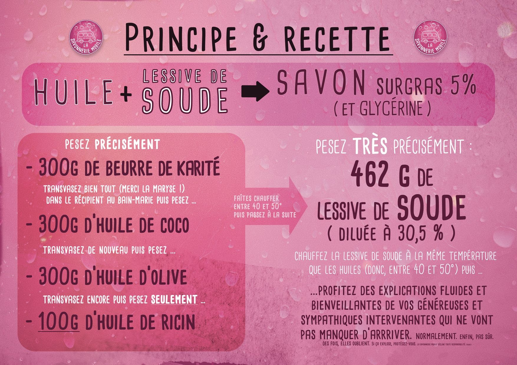 Le calcul de la recette a pour but de déterminer la quantité de soude à ajouter aux huiles. Ce calcul se fait à partir de l’indice de saponification de chaque huile. La proportion de chaque huile va donner les propriétés du savon.