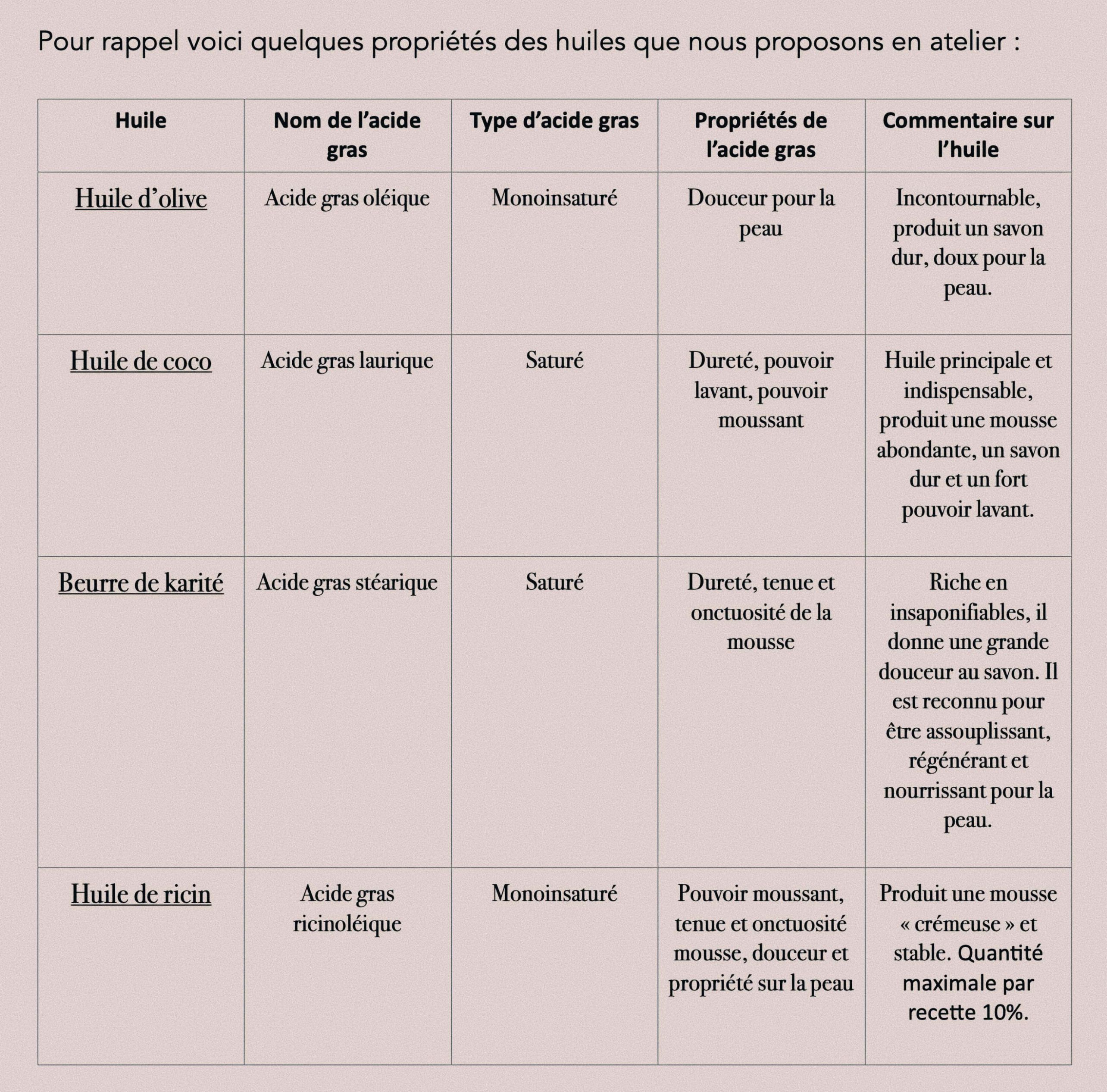 Les huiles et beurres végétaux contiennent une fraction d’in-saponifiable, des composés qui ne rentrent pas en réaction avec la soude. Le choix des huiles donnera des propriétés uniques au savon. De nombreux sites vous permettrons de mieux appréhender l’influence de la structure chimique de l’acide gras sur les propriétés du savon final. Ainsi les recettes contiennent entre 30 et 60% d’acides gras saturés qui garantiront la dureté du savon. Les acides gras insaturés apporteront leurs propriétés nourrissantes et adoucissantes pour la peau.